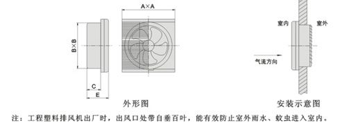 注:工程塑料排風機出廠時,出風口處帶自垂百葉,能在效防止室外雨水、蚊子進入室內(nèi)。