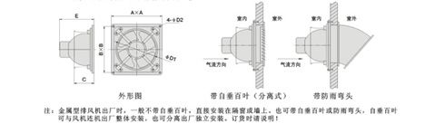 注:金屬型排風機出廠時,一般不帶自百葉,直接安裝在隔窗或墻上。也可帶自垂百葉或防雨彎頭,自垂百葉可與風機連機出廠整體安裝,也可分離出廠獨立安裝。訂貨時請說明!