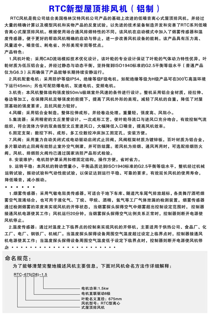 RTC鋁制屋頂風(fēng)機(jī)是引進(jìn)歐美技術(shù)聯(lián)合科研院校共同研發(fā)的一種環(huán)保、節(jié)能全鋁制屋頂風(fēng)機(jī),該產(chǎn)品外形設(shè)計(jì)流暢美觀,工藝精湛,符合高檔建筑對(duì)于外露設(shè)備質(zhì)感的要求,更適合排除帶有煙塵、油霧、潮濕等污染空氣,延長(zhǎng)電機(jī)及傳動(dòng)部件的使用壽命。采用鋁質(zhì)后向板形離心式葉輪,平衡等級(jí)高,氣流組織順暢,運(yùn)行平穩(wěn);具有重量輕、壓力高、風(fēng)量適中、噪聲低、耗電省、外形美觀牢固等優(yōu)點(diǎn),廣泛用于機(jī)械、化工、橡膠、制藥、輕紡等行業(yè)的車間高大廠房及高級(jí)民用建筑的屋頂排風(fēng)換氣。 JRTC(RTC)鋁制屋頂風(fēng)機(jī)一般采用直聯(lián)傳動(dòng),重量輕、免維護(hù)、使用可靠,用于屋頂排風(fēng)??芍艼RSC(RSC) 風(fēng)機(jī)用于屋頂送風(fēng)。 根據(jù)不同的使用環(huán)境和輸送介質(zhì),配用防爆電機(jī)制成防爆型,用于輸送易燃易爆氣體,產(chǎn)品通過國(guó)家權(quán)威防爆檢測(cè)機(jī)構(gòu)檢驗(yàn)認(rèn)可。配用耐高溫電機(jī)制成消防型,能在280℃高溫條件下運(yùn)行45min以上,可按設(shè)計(jì)要求配設(shè)入口排煙防火閥,風(fēng)機(jī)、防火閥均通過國(guó)家消防產(chǎn)品檢驗(yàn)中心型式檢驗(yàn)。 選配附件:按需要可配設(shè)重力式止回風(fēng)閥、防鳥(蟲)網(wǎng)、檢修開關(guān)、橡膠減振墊、集中控制箱等附件。 型號(hào):JRTC-鋁制屋頂風(fēng)機(jī) 機(jī)號(hào):300#~1000# 風(fēng)量:1100~51000m3/h 風(fēng)壓:20~580Pa 功率:0.18~11kW 用途:廠房及高級(jí)民用建筑的屋頂排風(fēng)換氣 行業(yè)對(duì)應(yīng)型號(hào):RTC等 產(chǎn)品特點(diǎn) 認(rèn)證:國(guó)家消防認(rèn)證、風(fēng)機(jī)型式檢驗(yàn)報(bào)告、防爆合格證 外殼:鋁材質(zhì)制作 葉輪:鋁質(zhì)模壓離心葉輪 電機(jī):低噪音風(fēng)機(jī)專用電機(jī),直聯(lián)傳動(dòng)